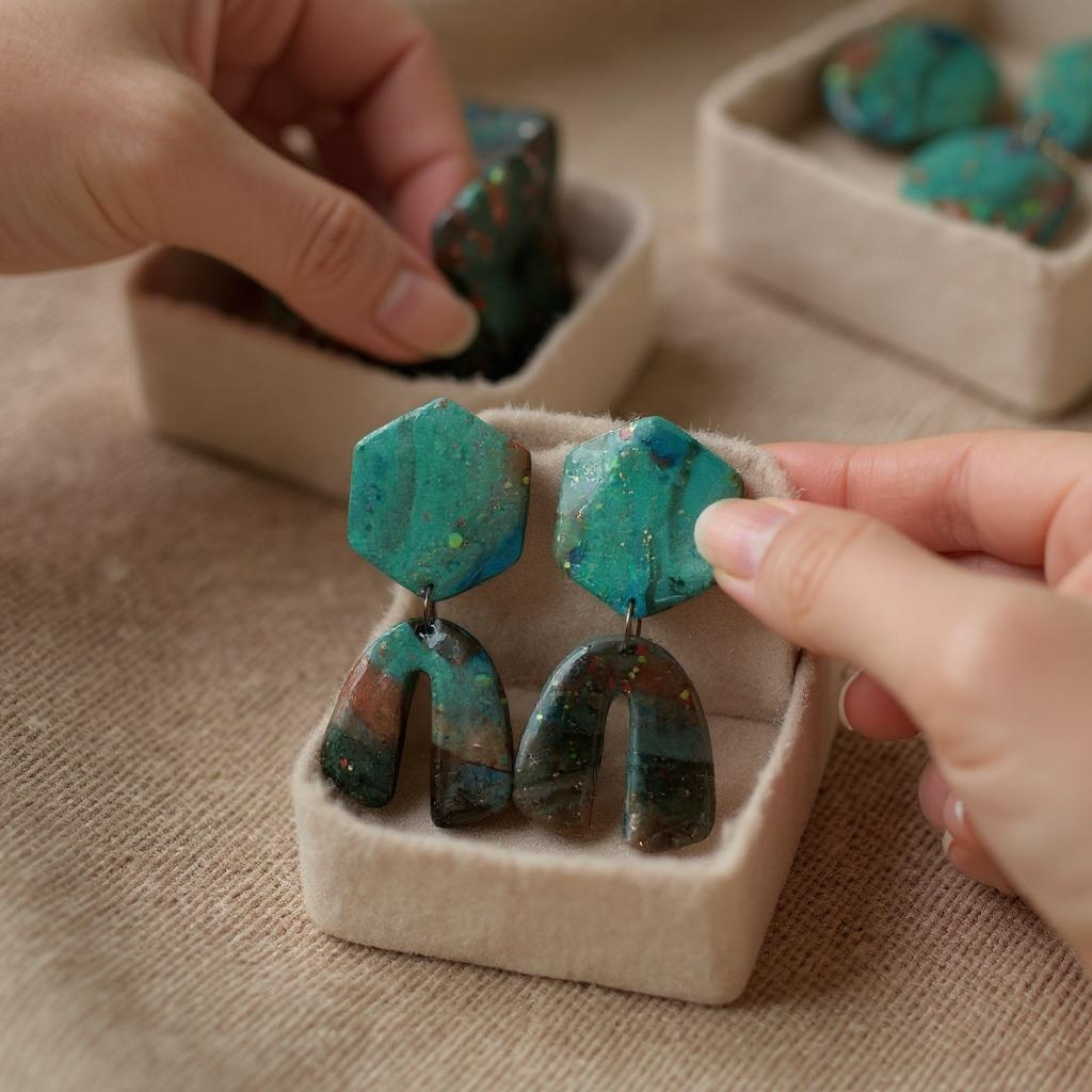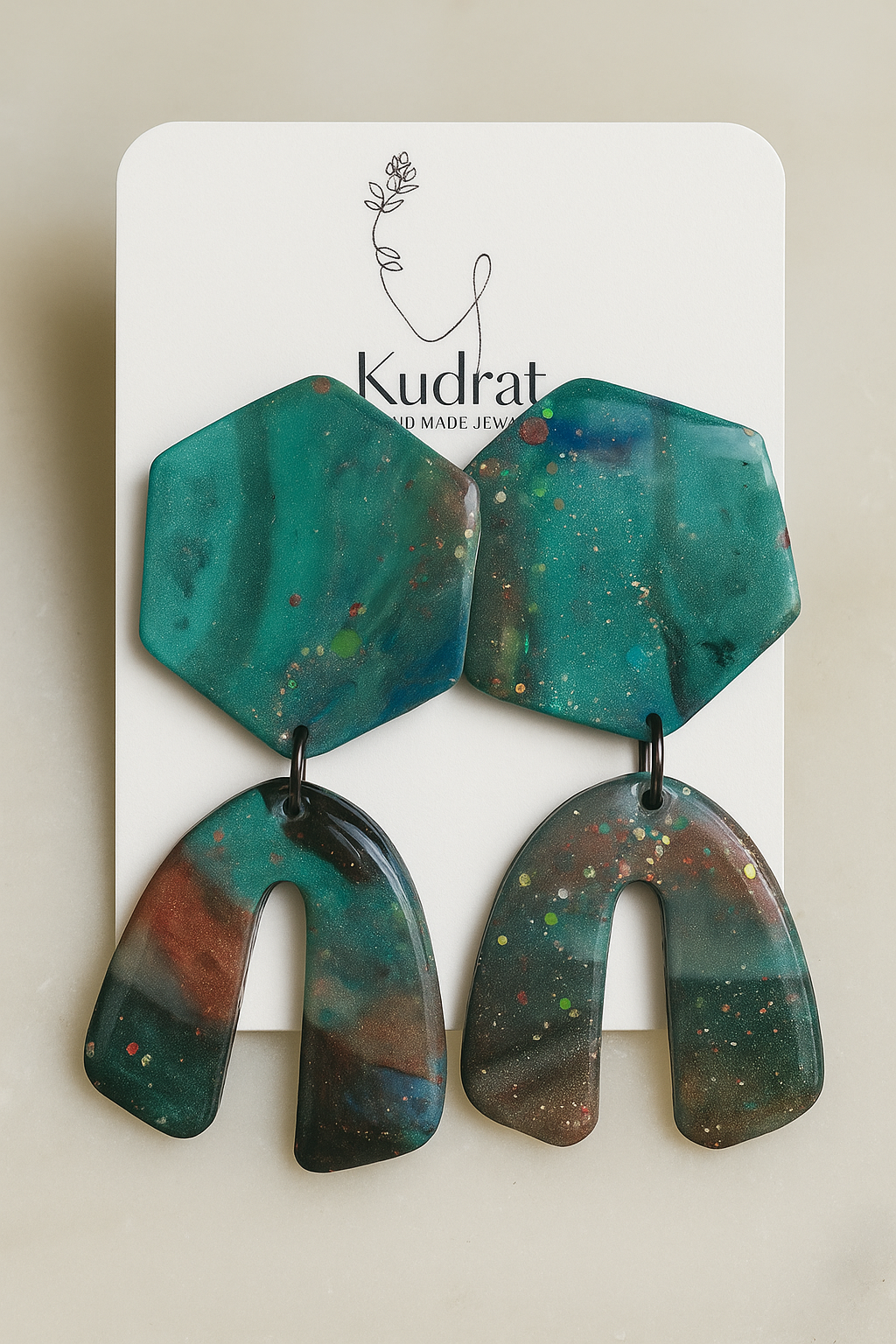 These bold statement earrings, capture the mystique of natural landscapes and celestial wonders. The top hexagon pieces boast deep teal tones swirled with shimmering flecks, while the bottom arch-shaped drops blend earthy reds, browns, and greens with specks of glitter that mimic stars in a galaxy. The organic flow of colors and subtle sparkle create a mesmerizing marbled effect—each pair as unique as the terrain that inspired it. Perfect for the artistic soul who finds beauty in the unexpected.