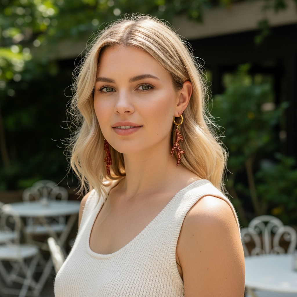 These striking crimson antler earrings blend nature-inspired design with a modern edge. Featuring shimmering gold flecks on deep red acrylic, they hang gracefully from sleek gold hoops. Lightweight yet bold, they add a perfect pop of festive charm and elegance — ideal for both everyday wear and special occasions.